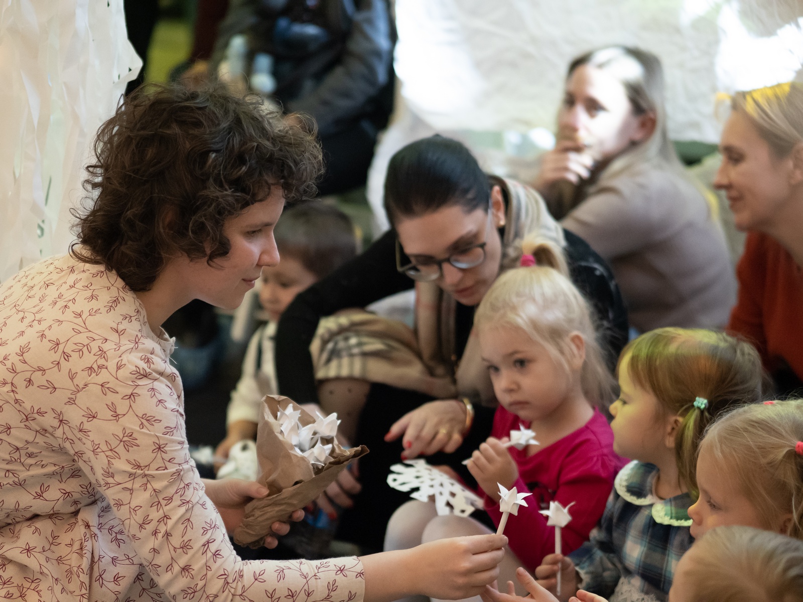 Для деток первый снег, первый дождь или первый листопад – настоящее чудо, а потому они очень внимательно наблюдают за происходящим и работой артисток. Формат спектакля – это бумажное волшебство – придумал режиссер Александр Хромов, который пришел к идее постановки, играя со своим ребенком. Из бумаги можно сотворить все что угодно: и корку на снегу, и морских медуз. Последние, к слову, такие большие и прекрасные, что располагают к тактильности, и малышам всегда позволяют поиграть внутри декорации после показа.