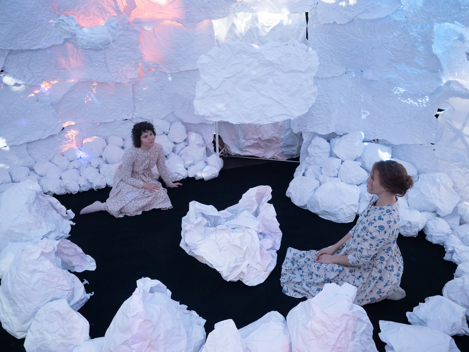 Белоснежный купол смонтировали из железного каркаса и нескольких десятков рулонов белой бумаги, сколько именно ее понадобилось – уже не считают. Как рассказывают актрисы Театра «Кот Вильям» Виктория Лавренова и Татьяна Борняк, подготовка к получасовому представлению занимает около 12 часов: помимо сценической адаптации, нужно подготовить снежинки и цветочки – их на каждом спектакле раздают малышам.