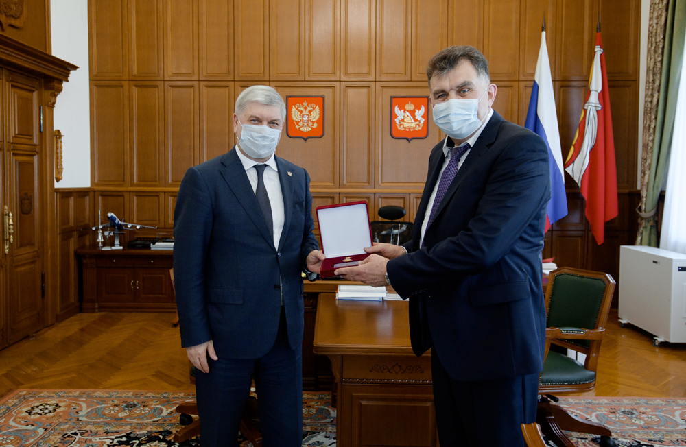 Во вторник, 22 марта, губернатор Александр Гусев и мэр Воронежа Вадим Кстенин в день 60-летия отметили профессиональные заслуги руководителя управы Железнодорожного района Леонида Беляева.