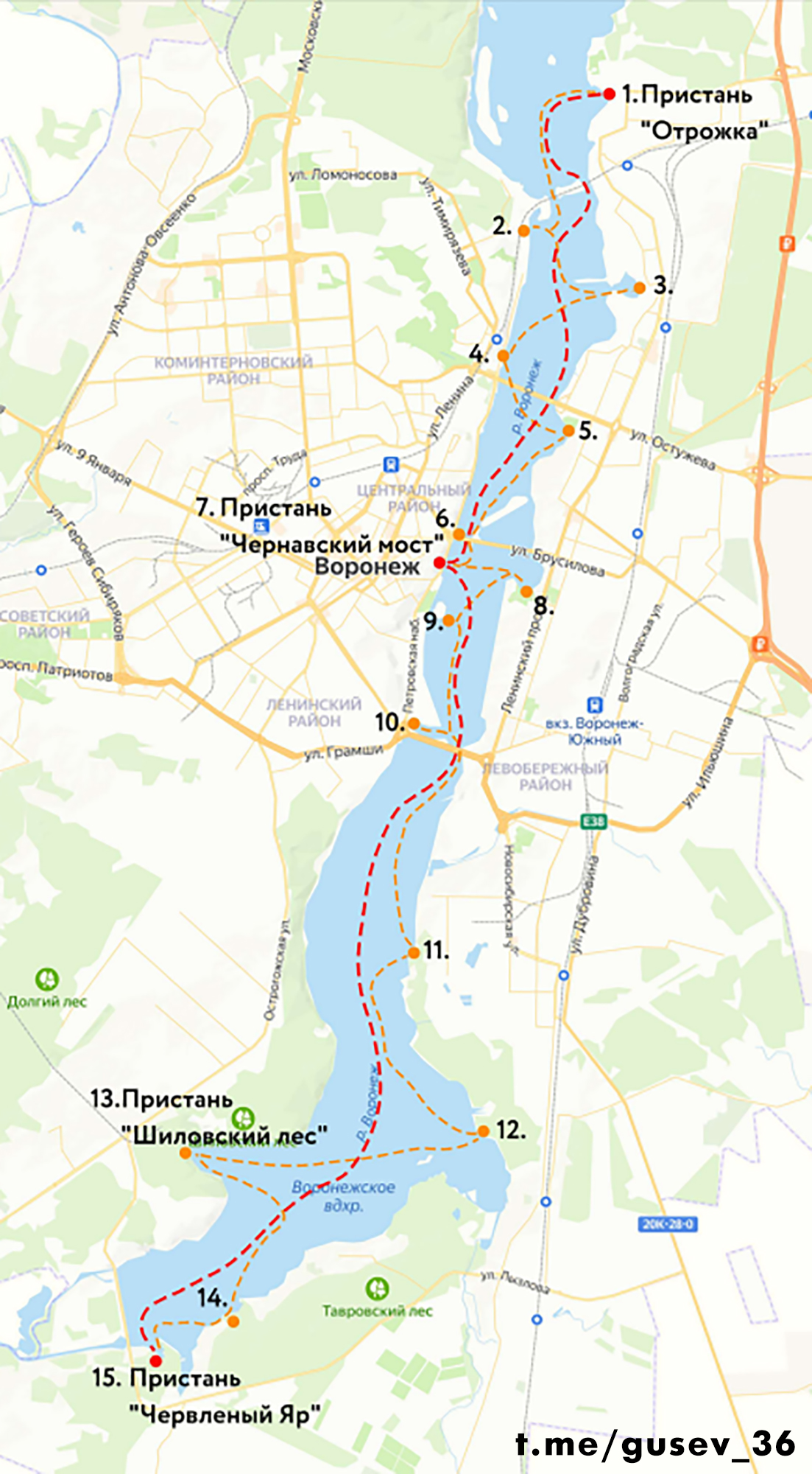 Предварительная концепция проекта включает 15 потенциальных пристаней по берегам водохранилища. Пристани, по словам губернатора, расположили исходя из сегодняшнего воронежского пассажиропотока и расположению спальных районов и парков.