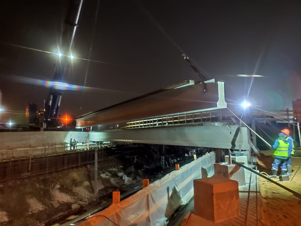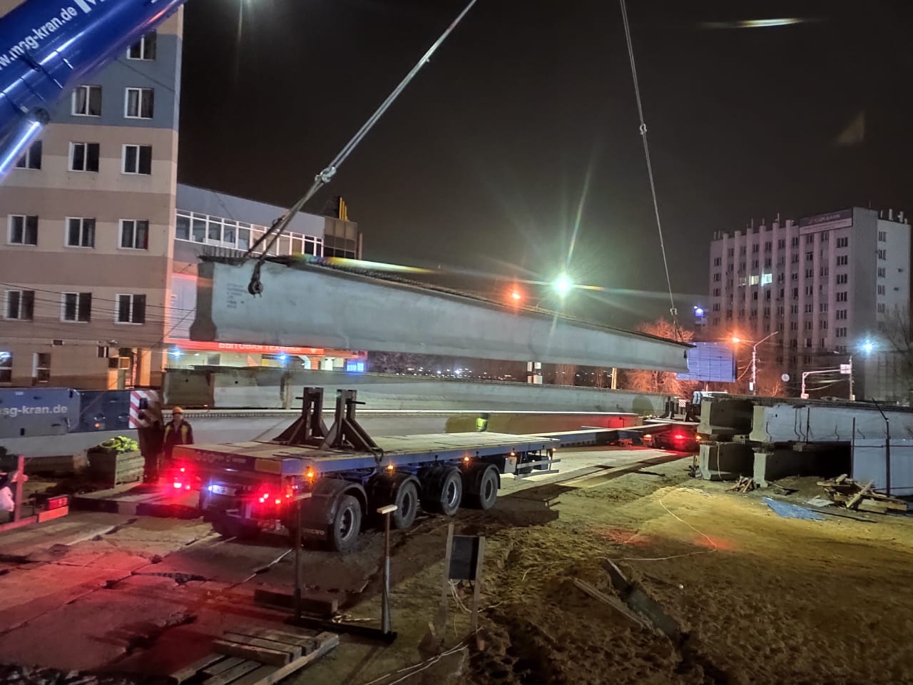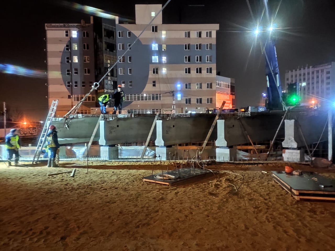 Монтаж начался в 1.02 – сразу после прохождения поезда. Работа прекратилась в три часа ночи, потому что для продолжения монтажа требовалось переместить огромный большегрузный кран. Передислокация крана пройдет сегодня днем, в завтра ночью монтаж балок продолжится.