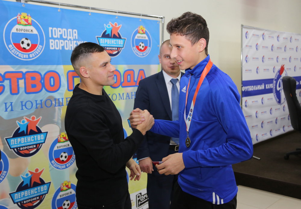 Чествовать лучших представителей воронежского футбола по итогам чемпионата и первенства Воронежа приехали руководитель городского управления физической культуры и спорта Александр Бахтин, вице-президент областной федерации футбола Александр Пешков, и особый гость – один их ведущих футболистов «Факела» – защитник Руслан Магаль.