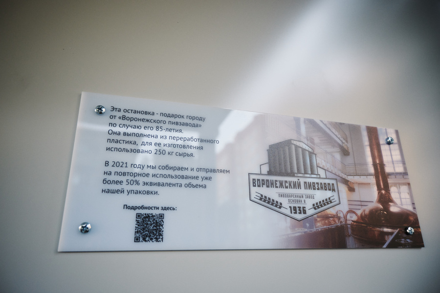 Остановку, для которой использовали 250 килограммов сырья, Воронежу подарили пивовары – сотрудники филиала компании «Балтика» – «Воронежского пивзавода» – в честь 85-летнего юбилея предприятия. Они с 2013 года реализуют проекты по переработке почти 50% от объема выпущенной упаковки – часть тары возвращают потребители.