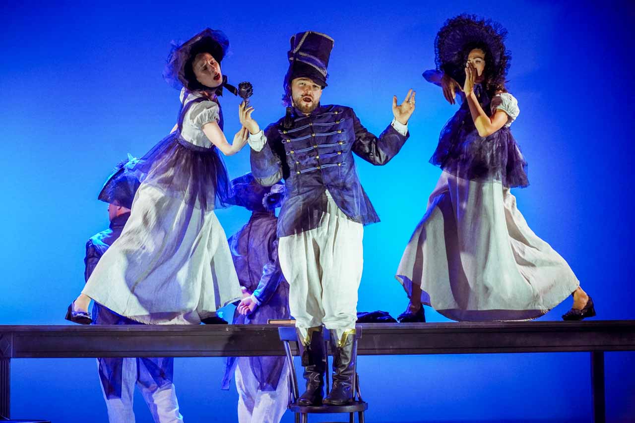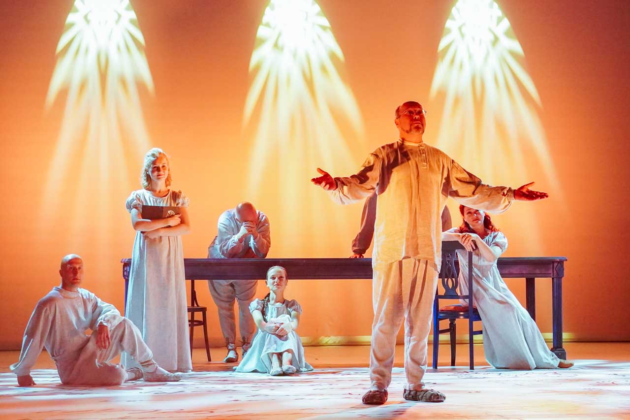 Кроме этого, гастрольная афиша тверичан включала недавнюю премьеру – спектакль «Барышня-крестьянка» по повести А.С. Пушкина (12+). Автор инсценировки и режиссер Евгений Зимин бережно сохранил в своей постановке авторский текст, при этом воплотил его легко и с юмором. Это абсолютно современный спектакль, в котором со зрителем говорят на простом и понятном языке. Кроме того, в спектакле найден весьма изящный прием пояснения устаревших имен и понятий: когда в тексте попадается что-то «из прошлого», один из актеров звонит в колокольчик и дает краткий комментарий, после чего действие продолжается. Нельзя не отметить лаконичную и вместе с тем очень интересную сценографию (художник-постановщик Елисей Шепелев), световое оформление (художник по свету Александр Рязанцев) и музыку, звучащую в спектакле (композитор Павел Крежевских). Пожалуй, этот спектакль вполне можно назвать образцом того, как нужно сегодня преподносить юному зрителю классику.