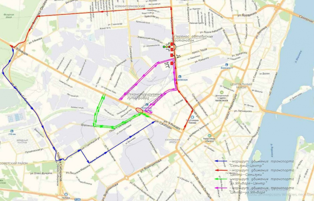 В связи с перекрытием движения по путепроводу на улице 9 Января и под ним будут временно изменены пути следования маршрутов общественного транспорта. Движение автобусных маршрутов будет направлено: