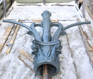 Специалисты говорят, что воссоздание элемента с кронштейнами для светильников было самым для них сложным в изготовлении. Работы проводили на основе оригинала с использованием 3D-принтера. Верхняя часть обнарядки опоры представляет собой чугунное литьё, вес его – примерно 200 кг. И это ещё максимально облегчённый элемент, ведь его закрепят на опору на высоте около 10 метров.