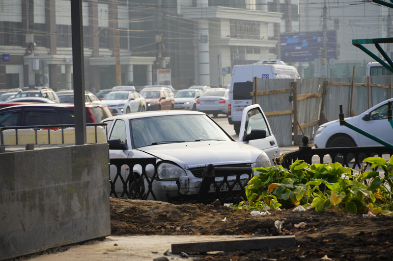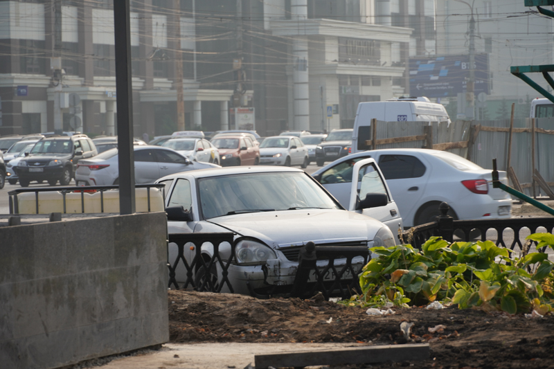 Заметим, что обстановка в этом месте усугубляется масштабным ремонтом подземного перехода, из-за чего часть дороги перекрыта строительным забором.
