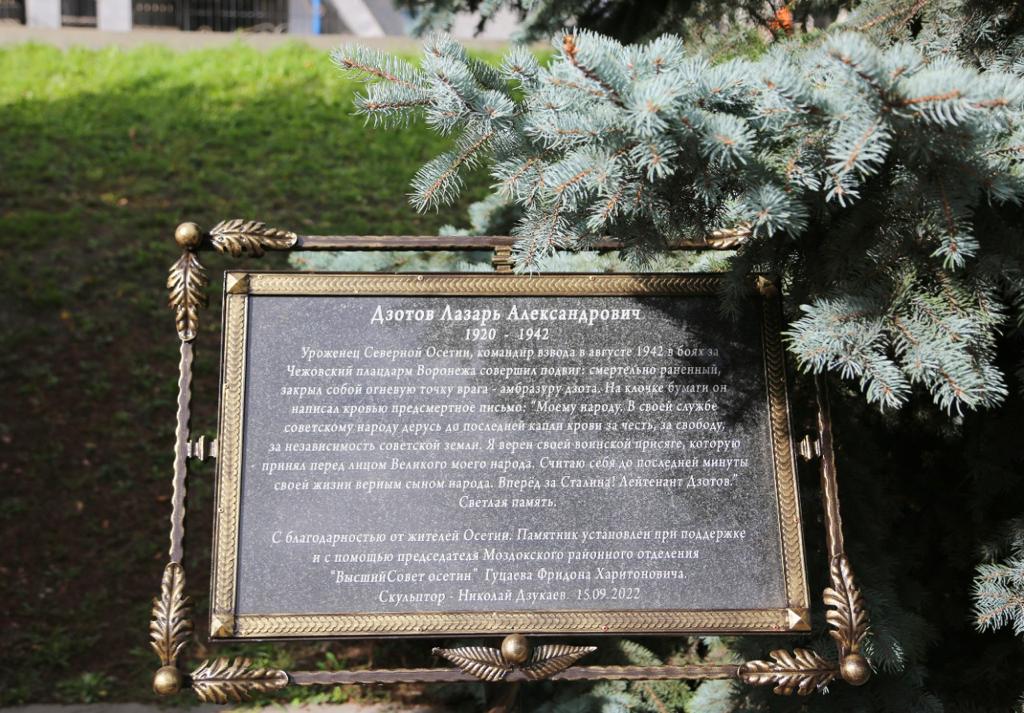 – Буквально накануне я подписал распоряжение о проведении открытого конкурса на лучший проект памятника в честь подвига воинов Красной Армии, закрывших собой амбразуры в боях за Воронеж. Таких героев четверо. И среди них – Лазарь Дзотов. Так что уже вскоре в Воронеже появится ещё один памятник с именем отважного воина. В наше непростое время, когда идеи патриотизма, самоотверженности и любви к Родине широко востребованы, это очень важно и значимо, – отметил Вадим Кстенин.