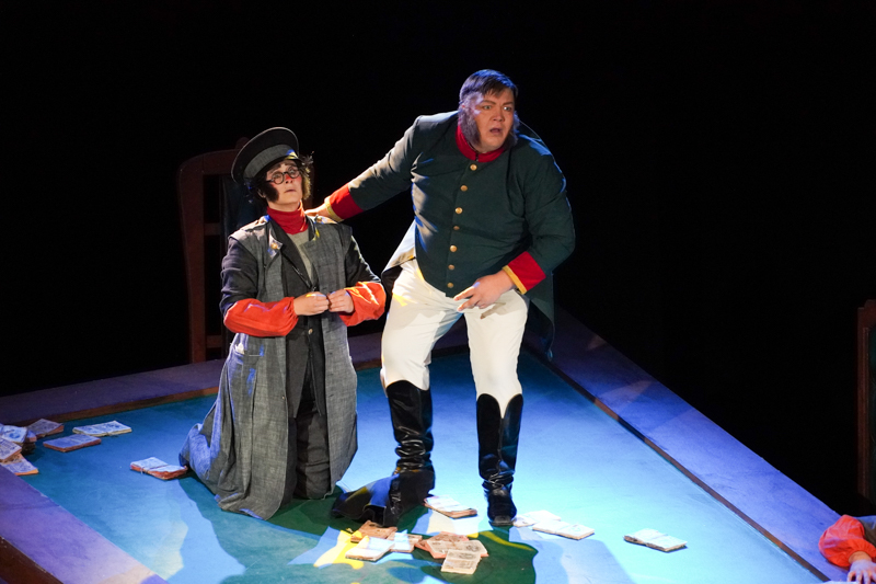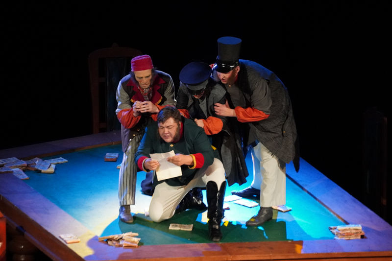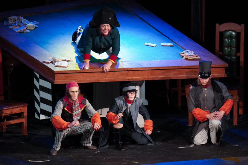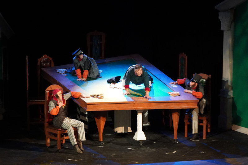 Бессмертной комедией Николая Гоголя архангельский театр открывал в прошлом году новый сезон, а саму подготовку к постановке сатирического шедевра начинали заблаговременно. Перед зрителями возникает занавес из многочисленных директив с печатями, как бы сигнализирует – бумажка в этом городе важнее человека. За ним – стол, который тоже по факту действующее лицо в спектакле – собирательный образ человеческих страстей: и алчность, когда стол используют как игральный; и чревоугодие, когда на нем изобилие еды и вина; лень и сладострастие Хлестакова, который решает погнаться за двумя зайцами в юбках…