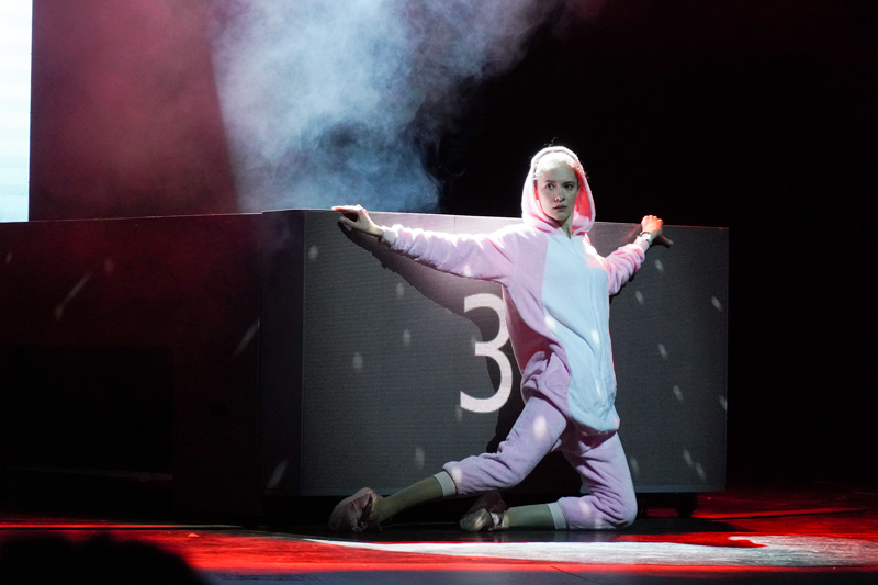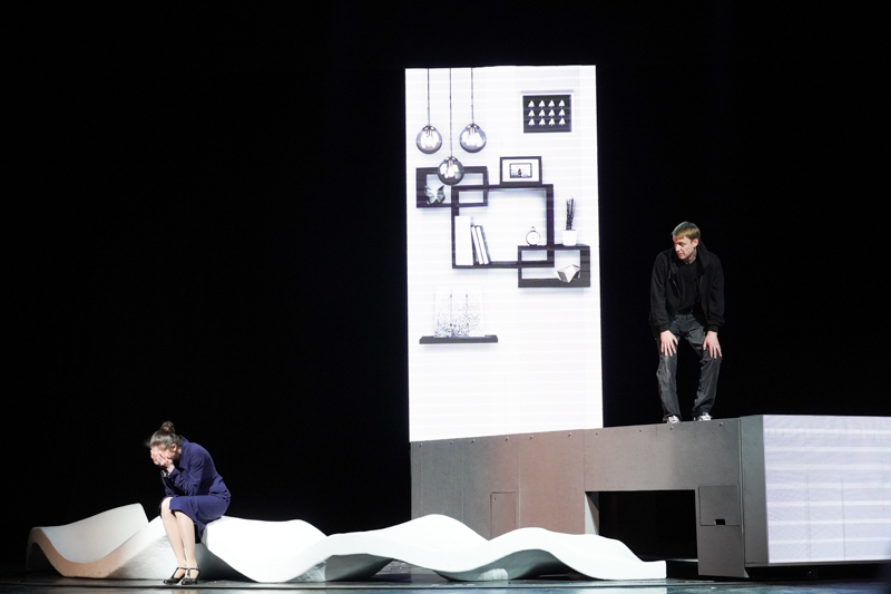 Постановщик, собирая свой спектакль, будто намеренно обращается к противоположностям. Дом Алексея (Юрий Смышников) – воплощение хаоса, а квартира Серафимы – сплошная матрица, а вместе с выводимыми с помощью экранов картинками, транслируется ощущение, что ты внутри какого-то зашифрованного кода…