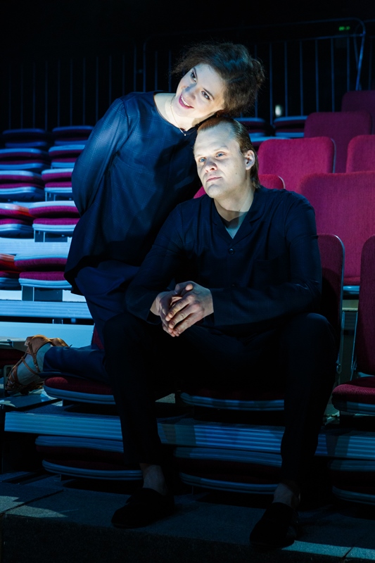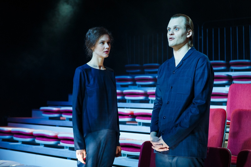 Вся сценография – в световом оформлении. Где бы актеры ни были, их все время разделяет «солнечная линия». Декорациями служат и зрительские кресла в противоположном «крыле» зала, которые Барбара и Вернер поднимают и опускают, ходят по ним и ударяют их. Вероятно, если вспомнить, что действие в пьесе происходит на кухне, героям стоило бы выпускать злость, ударив кулаком по столу или стене. Но все иносказательно, и когда Барбара спускается сверху вниз по креслам, она старается подавить в Вернере оставшееся желание сопротивляться: что ни ступенька – то аргумент.