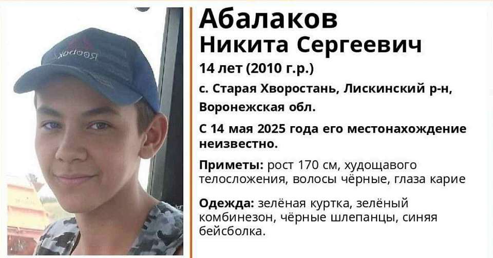 Четырнадцатилетний Никита Сергеевич Абалаков покинул дом ещё накануне — в среду, 14 мая. С тех пор никто не располагает информацией о его месте нахождения. Мальчик проживал в селе Старая Хворостань, Лискинский район Воронежской области.