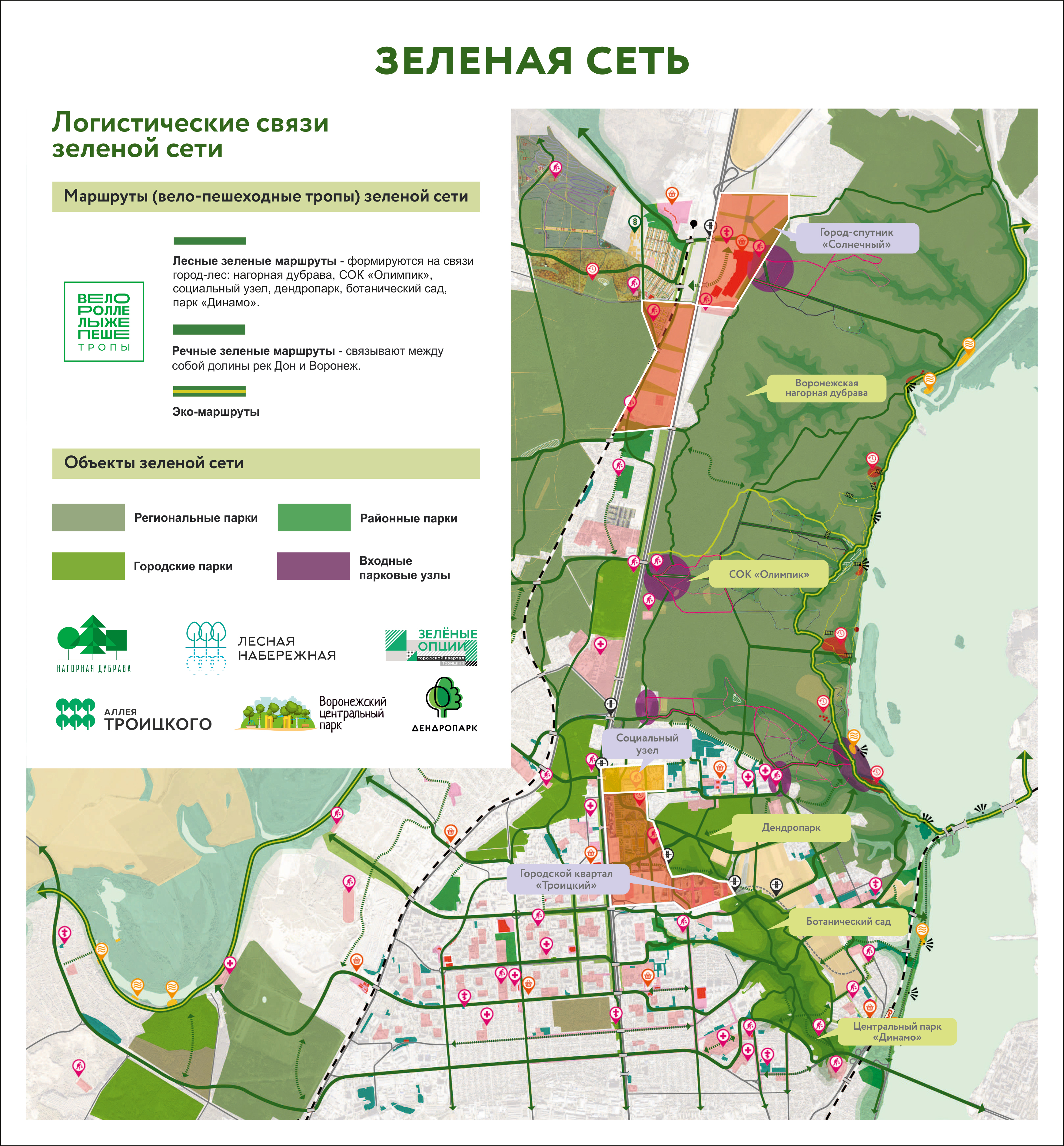 Во вторник, 11 июня, предприниматель рассказал главе области об этом проекте. По его словам, на данный момент Группой компаний Хамина вместе с голландской компанией разработан проект Зеленой сети северной части Центрального и части Коминтерновского районов, которая объединит Воронежский центральный парк, Ботанический сад с Лесопарком НИИЛГиС с подключением существующей и планируемой инфраструктуры квартала «Троицкий», спорткомплекс «Олимпик», Большую экологическую тропу и город-спутник «Солнечный» – в том числе Сити-парк «Град», построенный ГК Хамина.