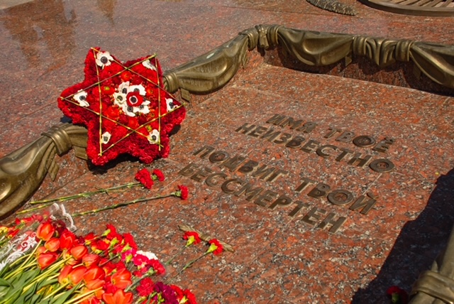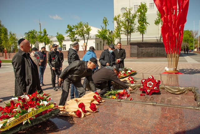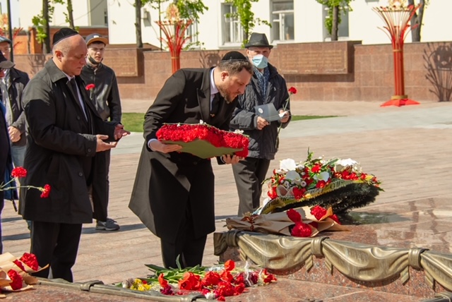 После поминальной молитвы члены общины пришли на площадь Победы и возложили к Вечному огню шестиконечный мемориальный венок.