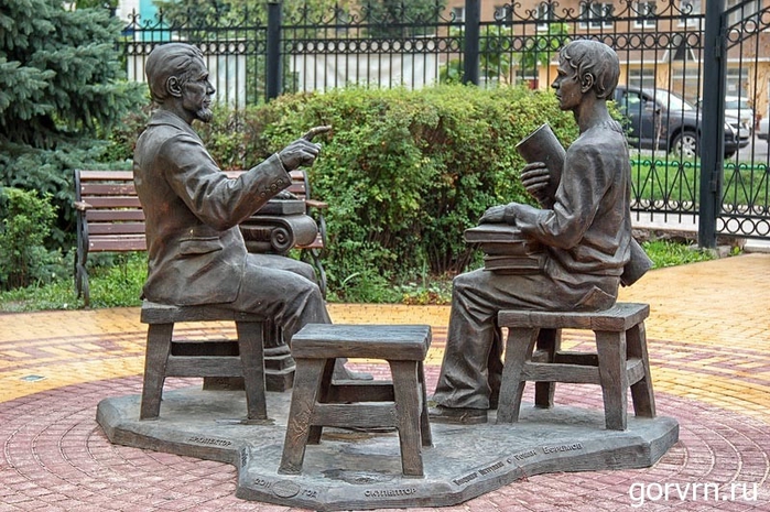 Памятник профессору и студенту на входе в Воронежский государственный архитектурно-строительный университет. Чтобы не завалить экзамен или зачет, накануне сурового испытания нужно обязательно сходить к памятнику и коснуться руки преподавателя – положительный результат на экзамене обеспечен! Кстати, скульптурная композиция включает еще и свободный табурет – если на нем посидеть, то вполне можно зарядиться знаниями – хотя бы на один день.