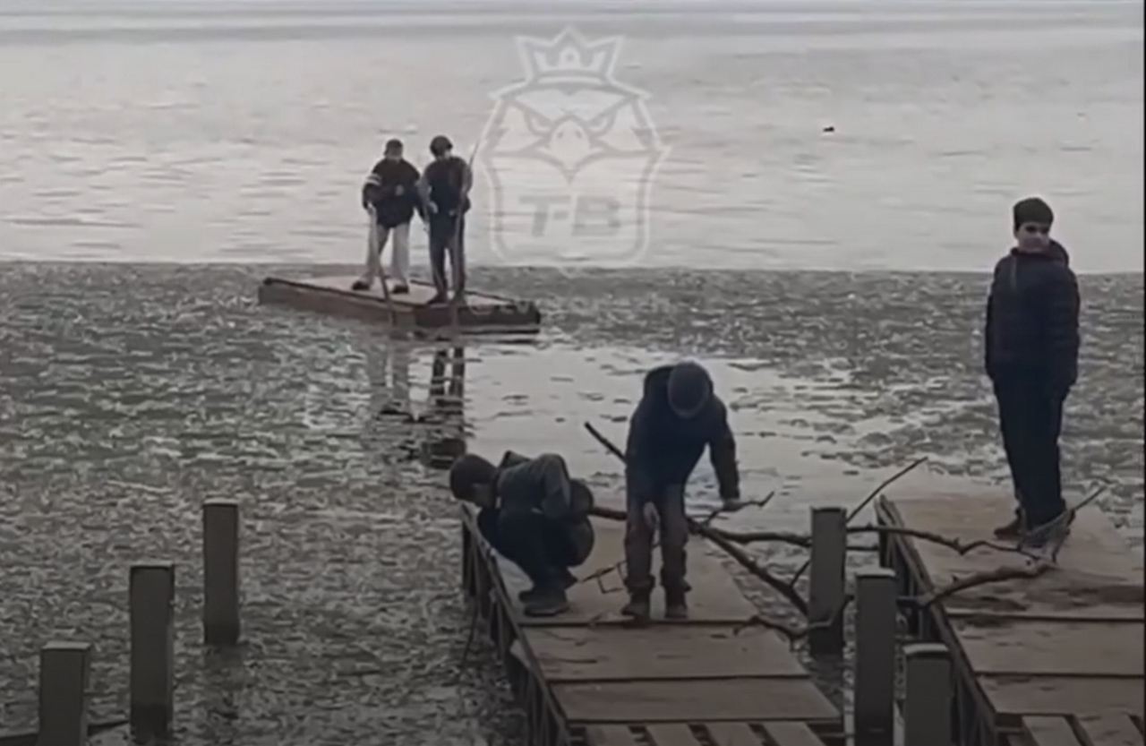 Два юных смельчака испытали своё судно, в то время как остальные наблюдали за процессом с берега, подбирая материалы для, возможно, будущих конструкций. Момент заплыва был снят горожанами и опубликован в социальных сетях.