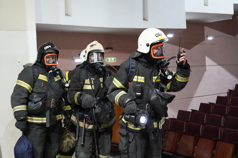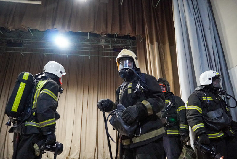 По легенде учений, загорание произошло на сцене большого зрительного зала дворца во время представления, администрацией была организована эвакуация, но несколько зрителей оказались отрезанными огнём.