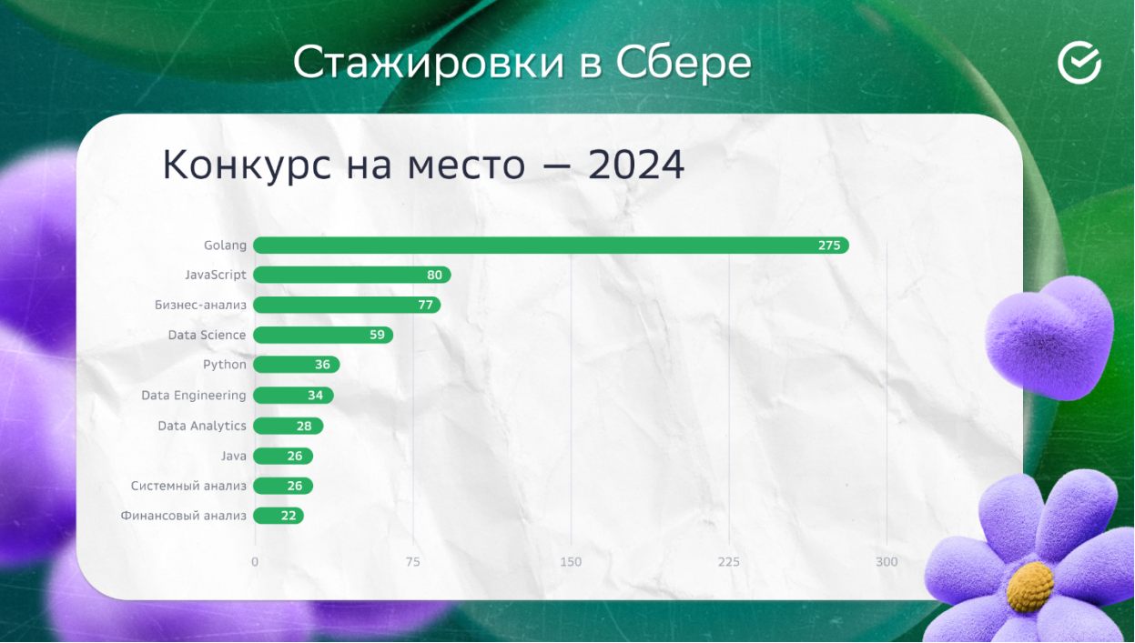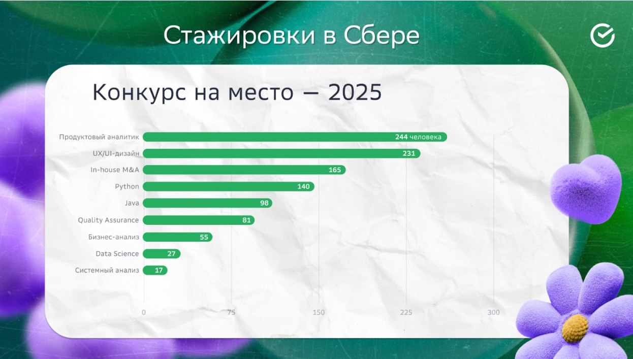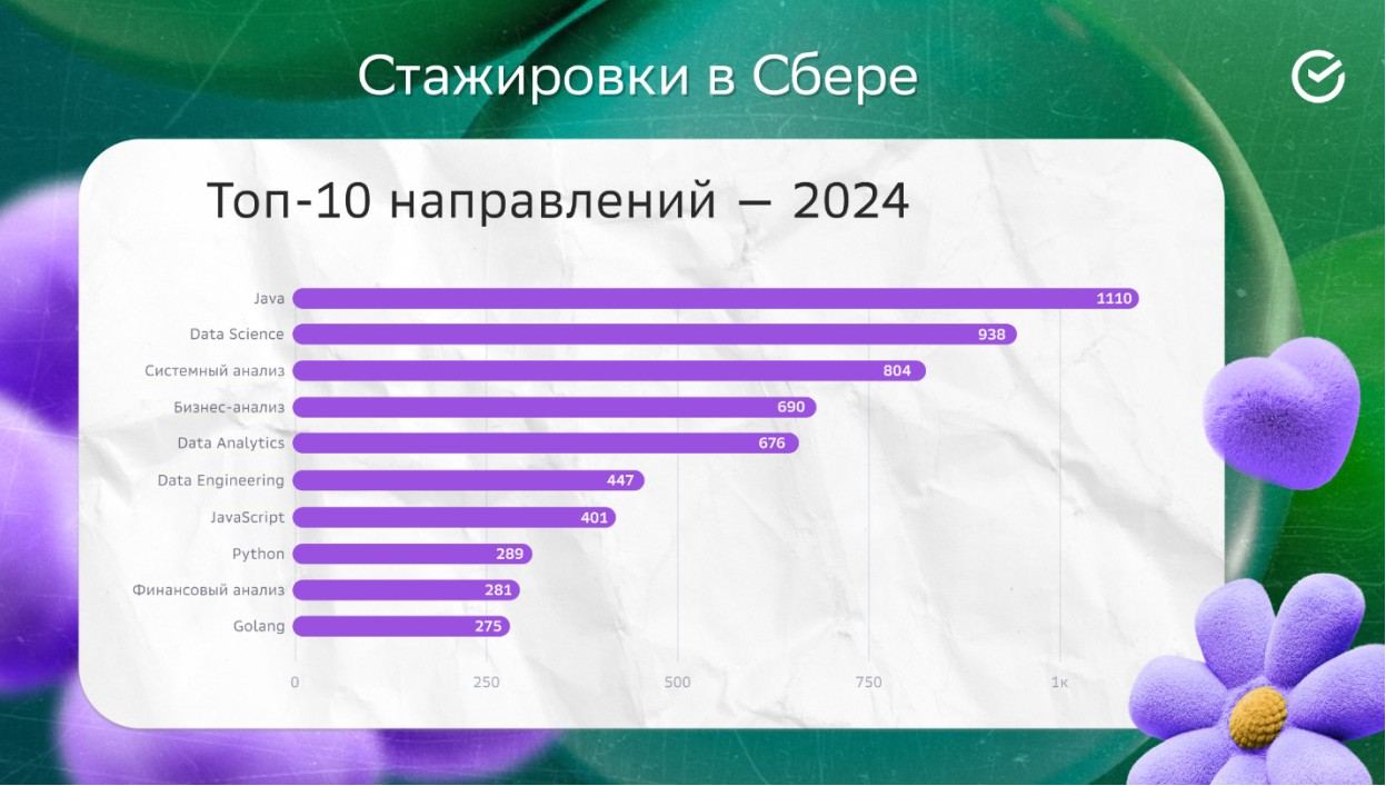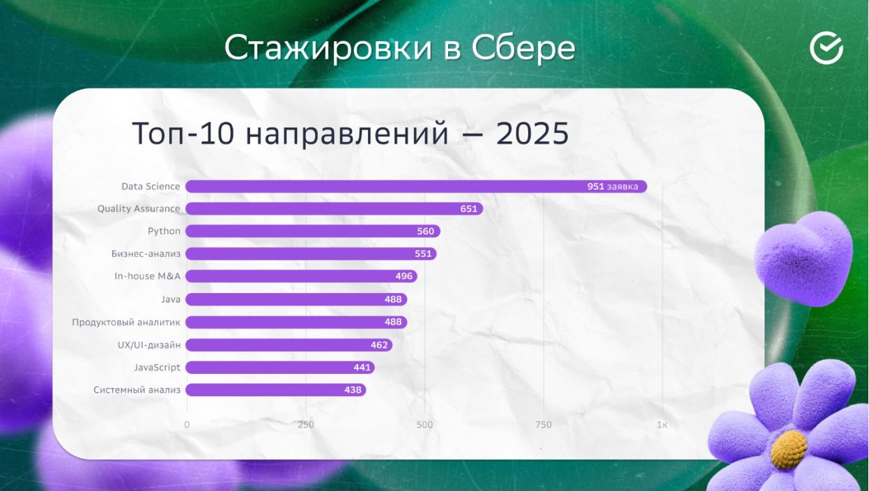 Самые популярные направления стажировок в этом году — Data Science (анализ данных и машинное обучение), Quality Assurance (обеспечение качества ПО) и Python (язык программирования). Год назад в топ-3 входили Java, Data Science и системный анализ.