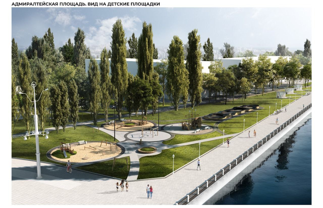 Планируется также восстановление ограждения набережной, облицовка подпорной стенки на Адмиралтейской площади. Вся территория должна получить новые малые архитектурные формы (урны, лавочки и т. д.), наружное освещение и многое другое.