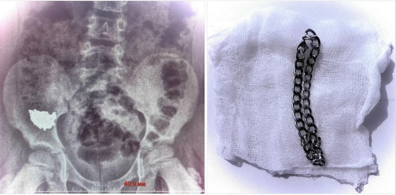 Рентгеновский снимок показал, что инородное тело находилось в правой подвздошной области живота. Ребёнок был госпитализирован для наблюдения. Поскольку снимки на третьи и четвёртые сутки не показали перемещения цепочки по желудочно-кишечному тракту, врачи приняли решение о срочном хирургическом вмешательстве из-за высокого риска перфорации кишки и развития перитонита.