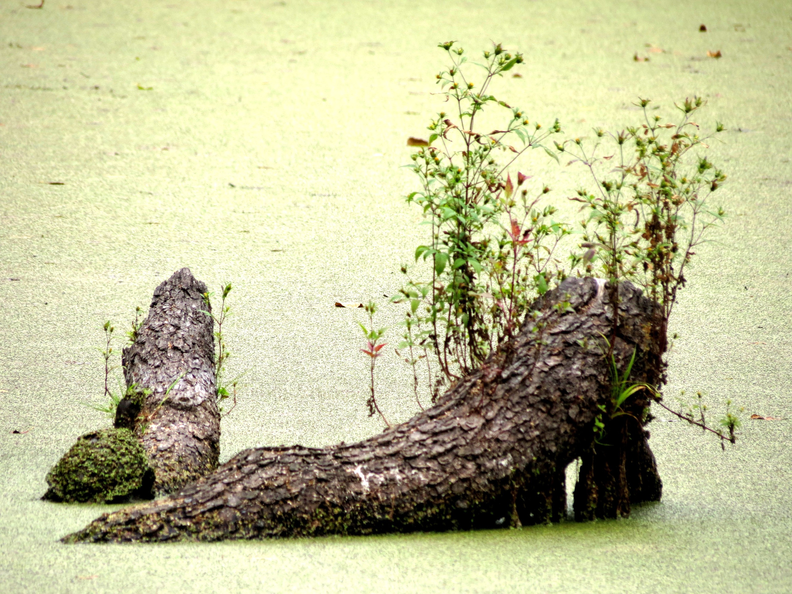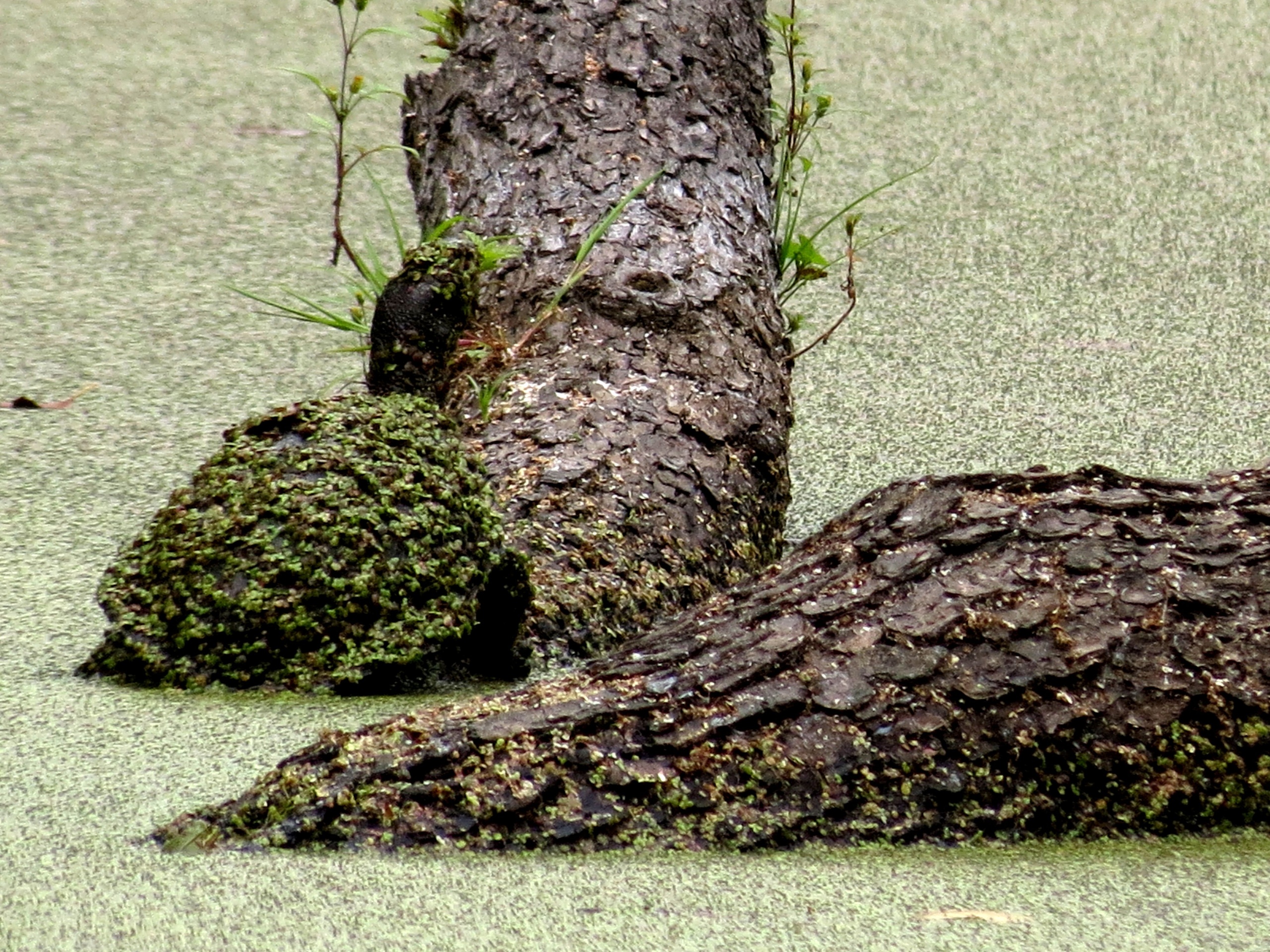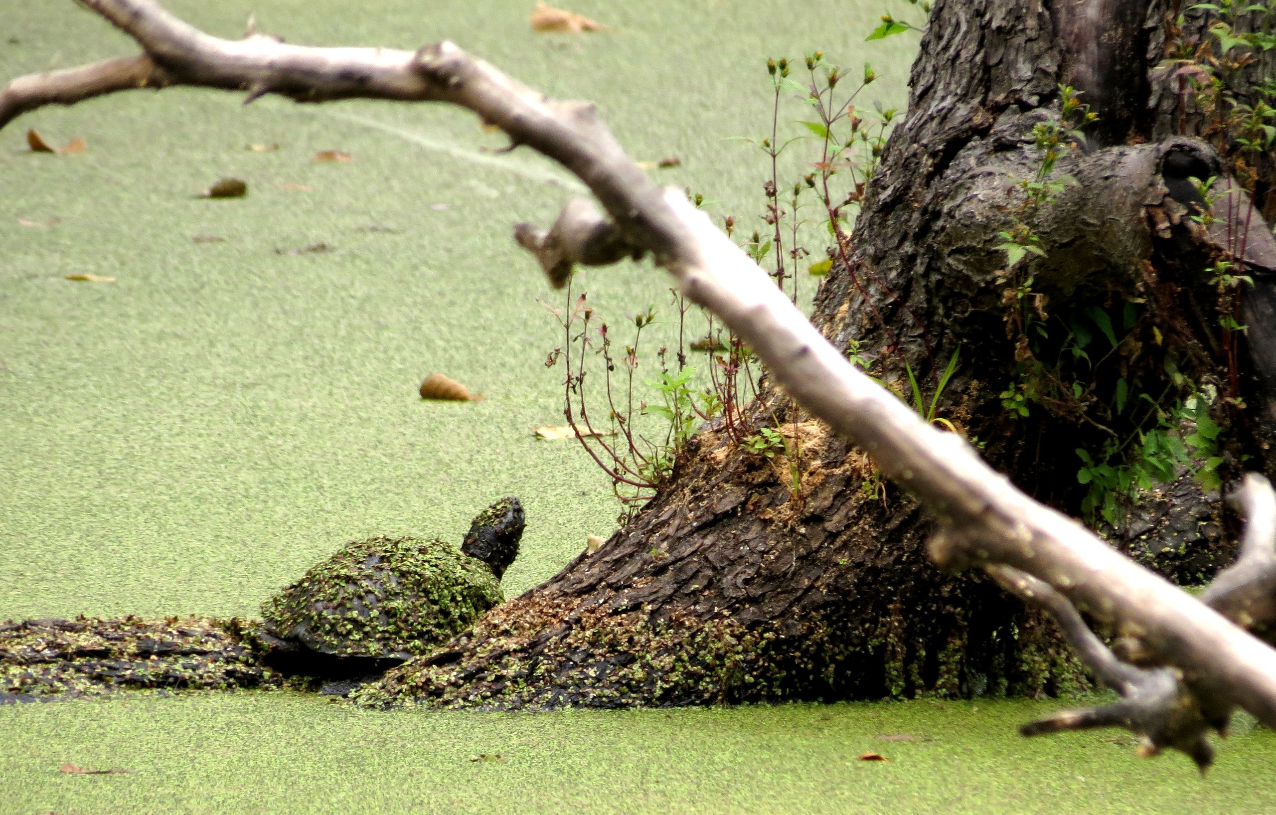 На первом фото изображен пейзаж: водоем, заросший тиной, старое дерево – и подпись: «Кто это у нас греется на осеннем солнышке в озерном камуфляже?». Интрига, впрочем, не держится долго: на следующих фотографиях легко можно разглядеть черепаху, панцирь которой покрыт той же тиной, из-за чего она сливается с пейзажем.