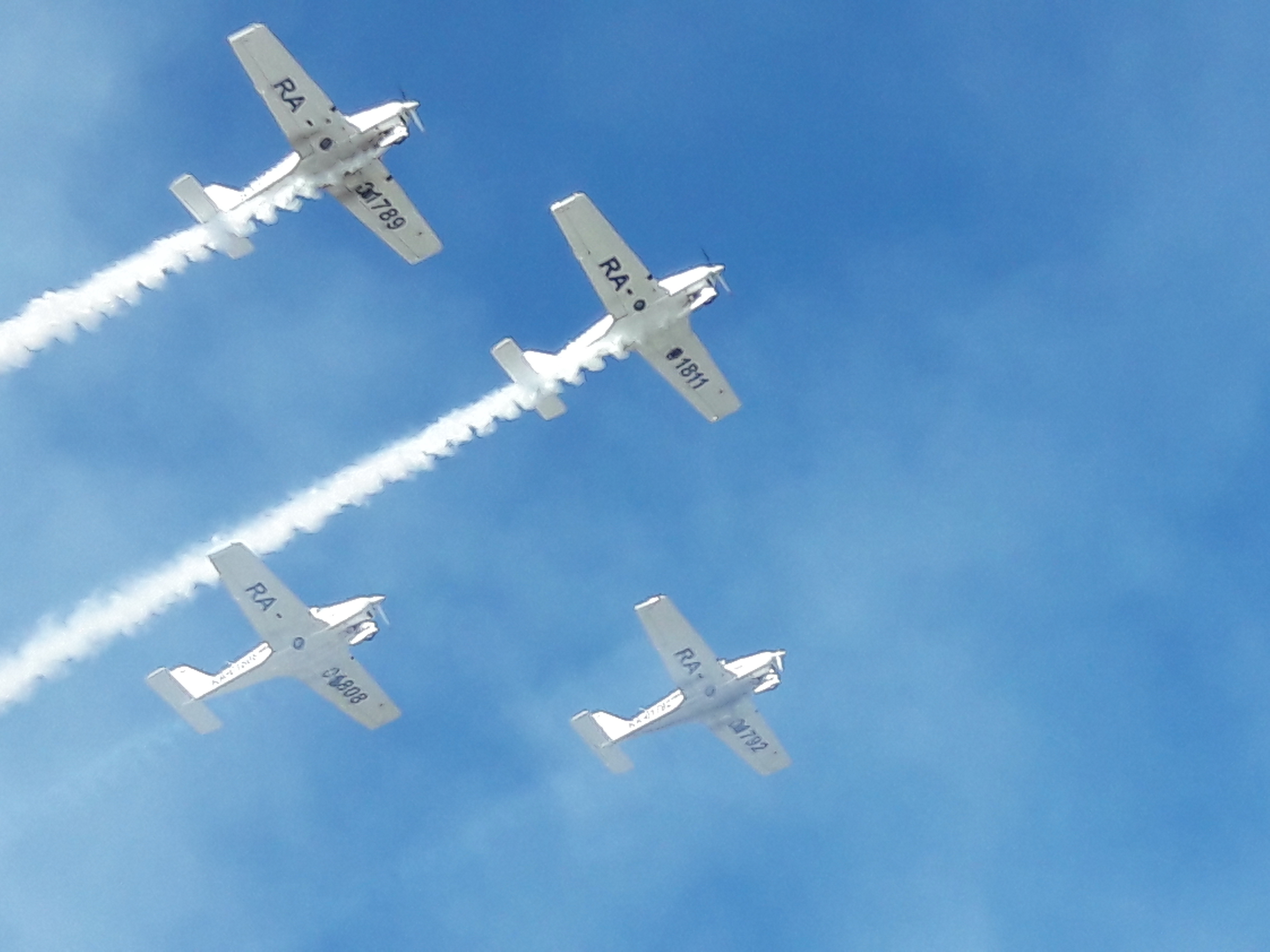Захватывающие трюки и виртуозные пируэты в небе над аэродромом в этот день продемонстрировали: пилотажная группа на поршневых самолётах «Первый полёт», пилотажная группа «Колибри» на спортивных низкопланах итальянского производства и лётчики боевых полков ВКС на многофункциональных сверхзвуковых истребителях-бомбардировщиках Су-34 и тяжёлых многоцелевых истребителях Су-30 СМ.