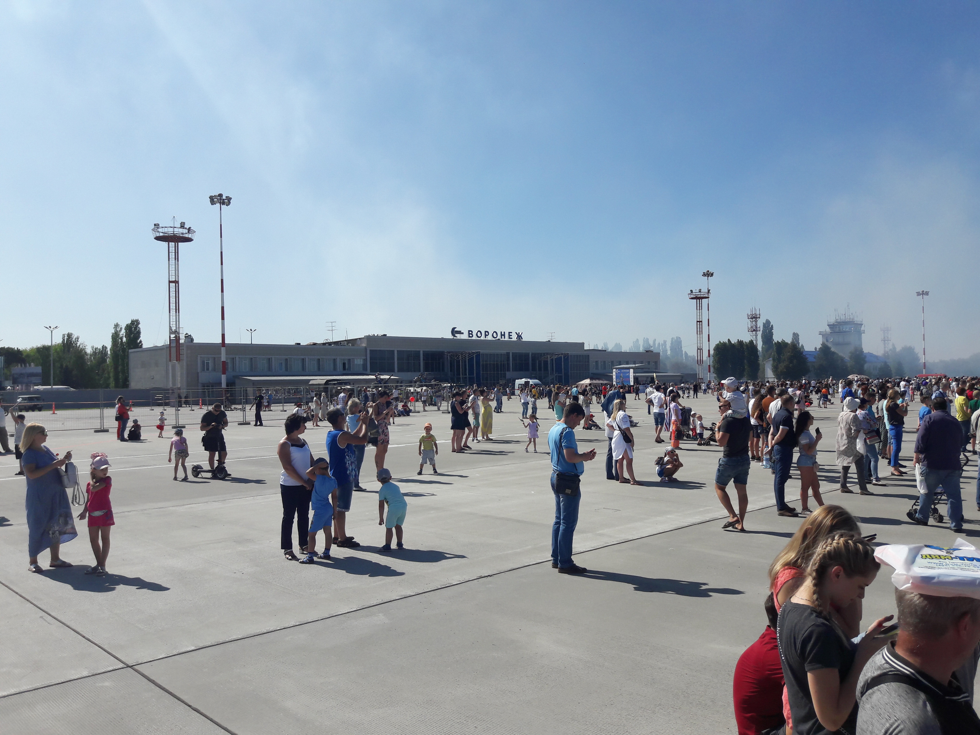 Как и обещали организаторы, на лётное поле можно было пройти всем желающим. Правда, очередь туда выстроилась очень и очень длинная. Ну, так понятно, досмотр всё же был необходим. Это же аэропорт. Не дай Бог что… К тому же прибытие и отправление рейсовых самолётов никто не отменял. Они плавно вплелись в структуру праздника в качестве бесплатного аттракциона.
