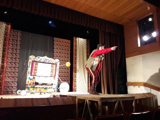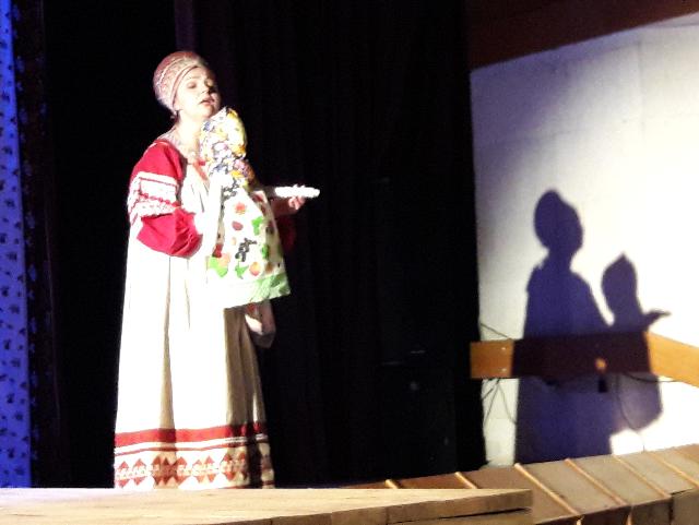 Потом на большой сцене для ребят начался настоящий спектакль «Колобок». Задорный путаник-сказочник Иван неспешно начал свой сказ, к нему присоединилась разудалая сказочница Марья. И вот что удивительно: известная нам с малого детства сказочка «Колобок» началась отнюдь не с главного персонажа и даже не с деда с бабой, а с ужасного Кощея Бессмертного. Из дыма и смрада он вырвался всей своей колдовской сутью из мешочка сказок, пугая притихших ребятишек.