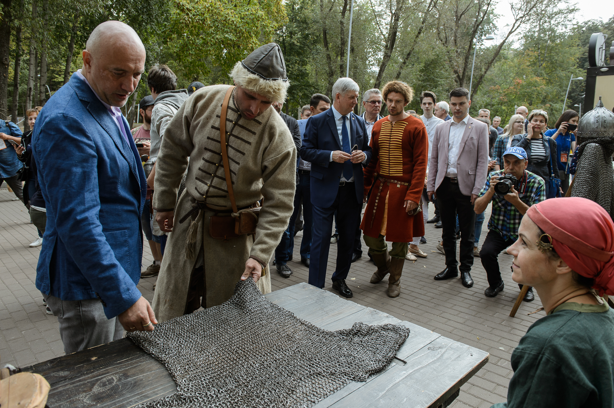 Глава региона совместно с президентом фестиваля осмотрел площадки форума. В программе – лекции и реконструкции, книжная ярмарка, исторические баттлы, концерты, спектакли. Кроме того, работали различные интерактивные зоны для детей – им предлагали, например, пострелять из лука, перевоплотиться в сумоистов, отправиться в сказку. Губернатор осмотрел древнерусскую ладью, пообщался с дружинниками IX–XI веков, петровскими гвардейцами, солдатами русской императорской армии и даже сыграл на старинных музыкальных инструментах. Хранитель «Музея забытой музыки» Сергей Плотников собрал на фестивале маленький ансамбль: Александр Гусев и Захар Прилепин сыграли дуэтом, но не без помощи мастера.
