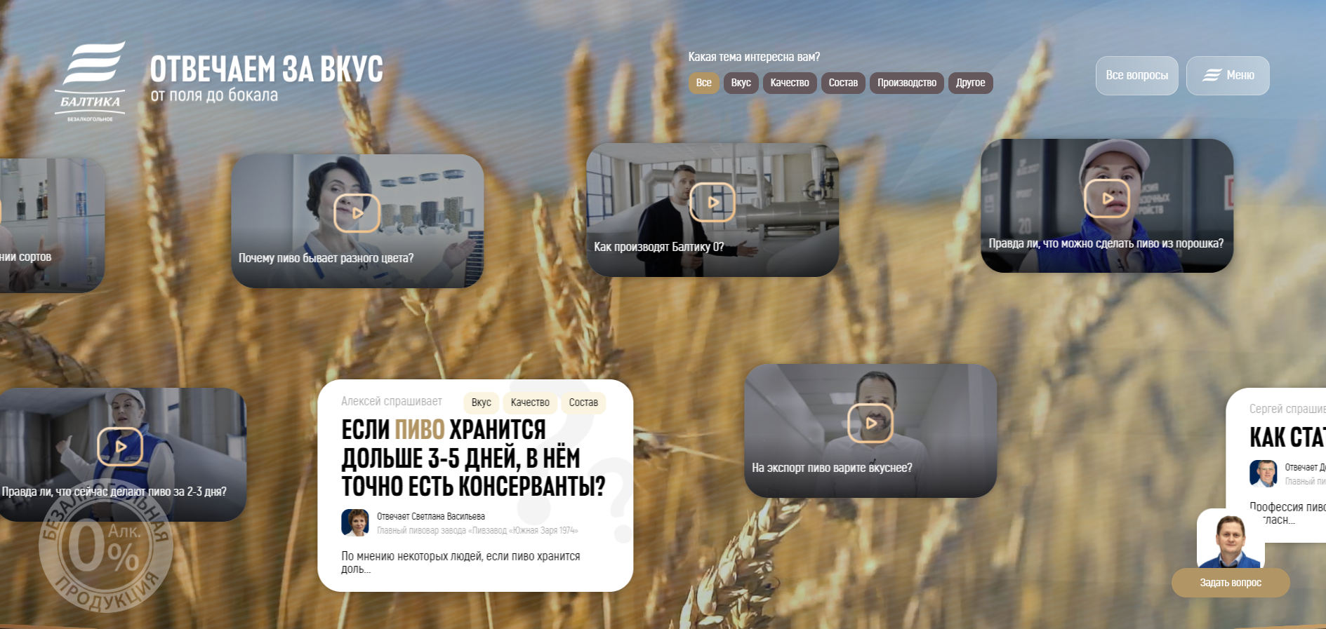 Новый проект позволяет бороться с мифами и заблуждениями, которыми окутан процесс пивоварения. В роликах, размещенных на портале, реальные специалисты без декораций и постановок говорят о производстве, отвечают на самые распространенные вопросы онлайн пользователей. Впрочем, если вы хотите задать свой вопрос лично, то можете сделать это. Приходите в гости на экскурсии на одном из восьми заводов, где они доступны.