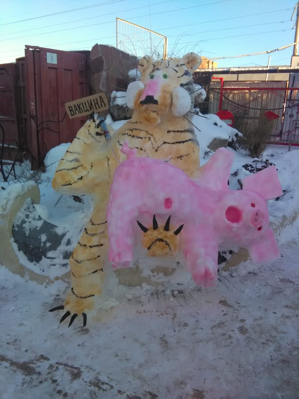 Ежегодно на воронежском авторынке появляются веселые снежные цветные фигурки зверей. Началось все с композиции «Три поросенка» в 2019 году, которая пришлась по душе всем воронежцам. В наступившем 2022-м тот же мастер порадовал воронежцев новым шедевром – хозяин года Тигр схватил розового поросеночка, чтобы вакцинировать его.