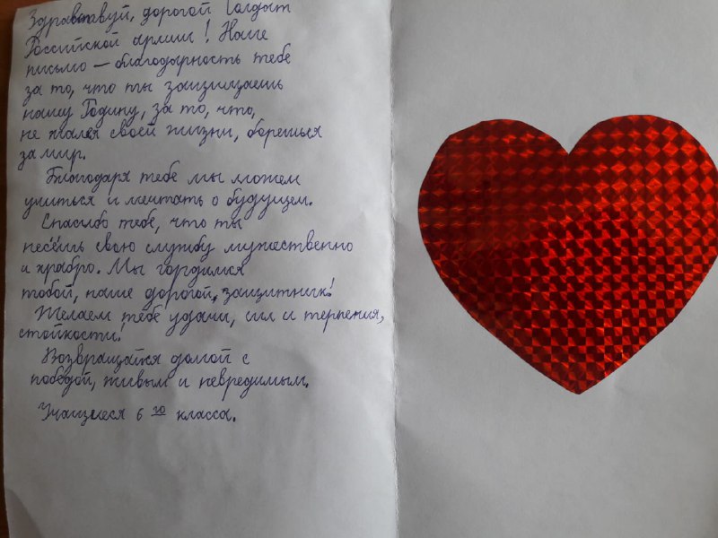 «Очень надеемся на тебя! Низкий поклон твоим родителям, что воспитали тебя, готового защитить честь нашей Родины! Пусть Господь сохранит твою жизнь и жизнь твоих товарищей! Это очень важный этап в твоей жизни, который будешь потом вспоминать с гордостью!» – написано в одном из писем.