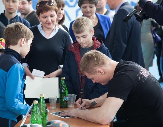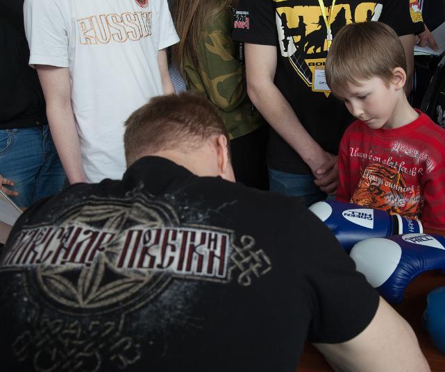 Кроме того, дети узнали, что титулованный Русский Витязь может подтянуться на турнике 50 раз, а отжаться – всего 30. Старшеклассник Андрей, который очень любит Александра Поветкина, вызвал кумира на бой. Боксёр продемонстрировал несколько приёмов, которыми пользуется на ринге. Андрей сказал, что даже не мог и мечтать о том, что сможет поучиться у любимого спортсмена.