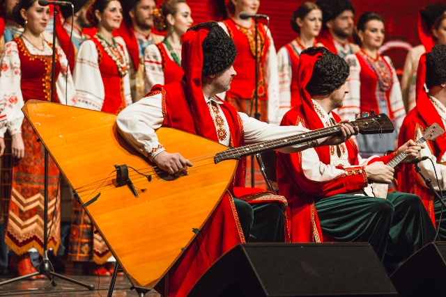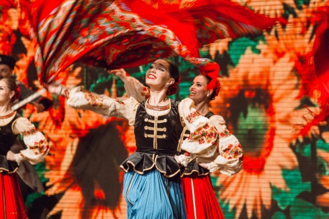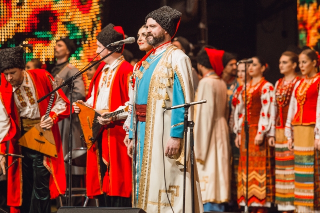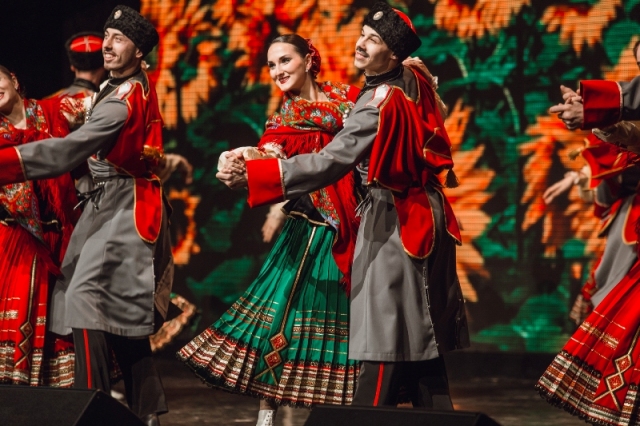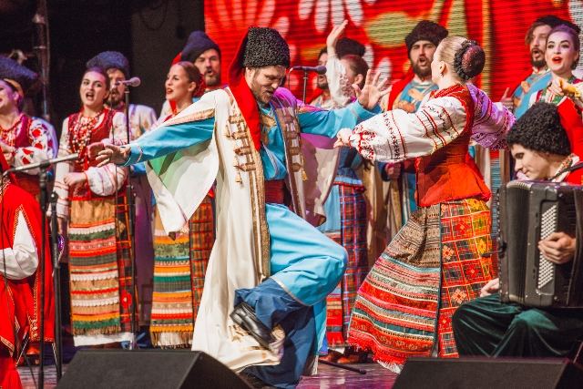 Солистки хора предстали перед публикой в этнических украинских нарядах и городском костюме кубанской казачки конца XIX – начала XX века. Солисты были одеты в черкески – классическую военную форму кубанских казаков. А вот артисты балета успели сменить за время концерта аж пять комплектов костюмов – на каждый танец у них был соответствующий тематике наряд.