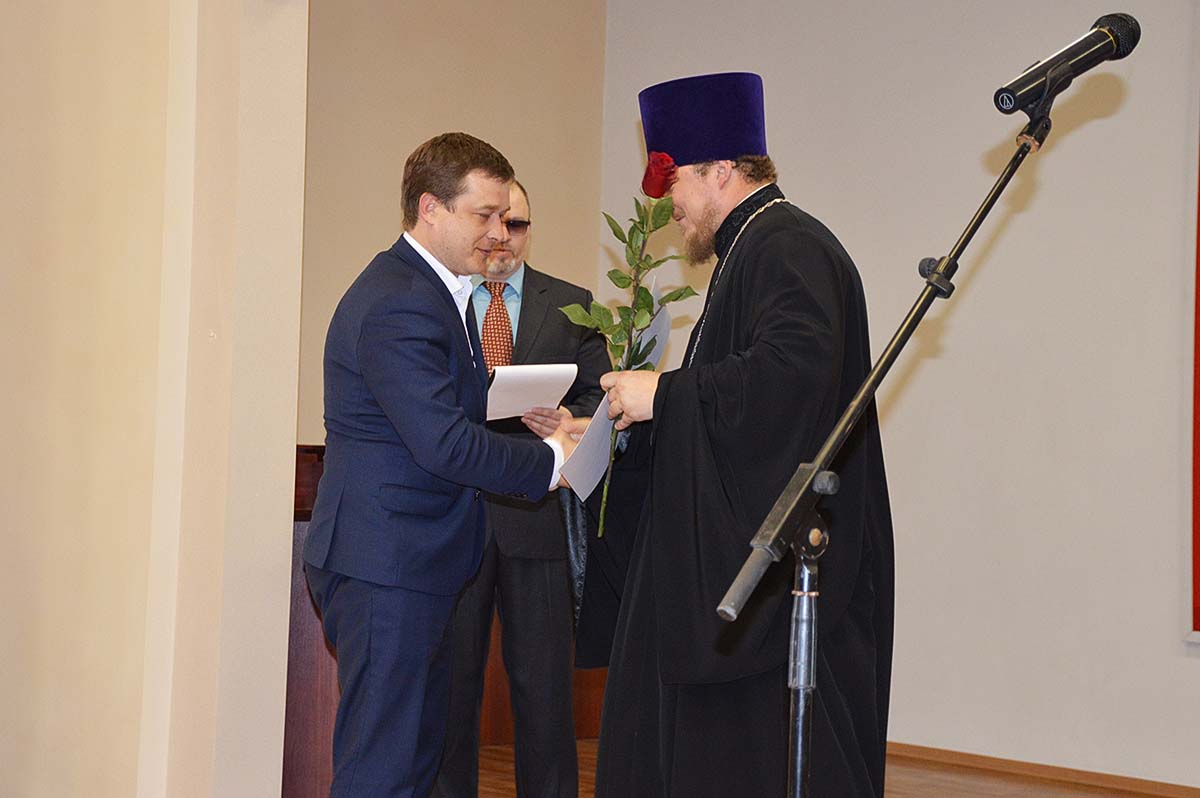 Вручение наград Воронежской епархии прошло в актовом зале ДСК. Архиерейские грамоты строителям вручил секретарь Воронежского епархиального управления, настоятель храма в честь иконы Божией Матери «Всецарица» протоиерей Андрей Скакалин. Особую награду – медаль святителя Митрофана III степени – отец Андрей вручил генеральному директору АО «ДСК» Александру Трубецкому.