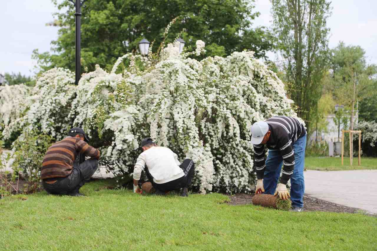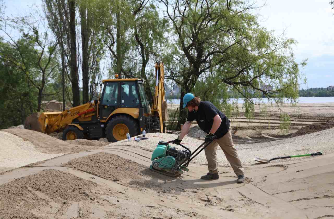 Что касается первой и второй очередей, то на сегодня там работают более 100 человек и порядка 30 единиц техники. На первой очереди завершается озеленение и мощение, идёт устройство покрытия для беговой дорожки – терравея, завезли и начали устанавливать туалетные модули.