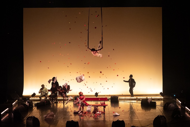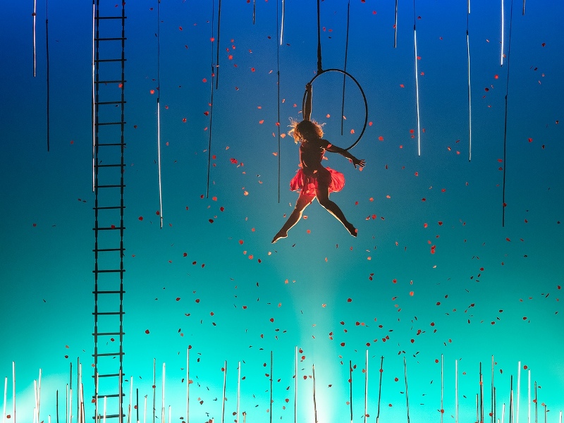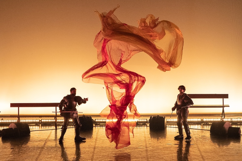 Импровизированный сад на сцене, акробаты, парящие в воздухе и рыцари в доспехах. Артисты играют не историю, а, скорее, саму жизнь, приоткрывая для зрителей внутренний мир компании. Легкие ткани, возвышающиеся над сценой, так легко поднимаемые ветром, парят в невесомости, словно чья-то душа, душа Жюли, всегда присутствует рядом.