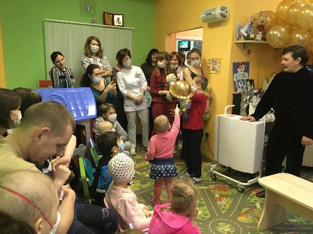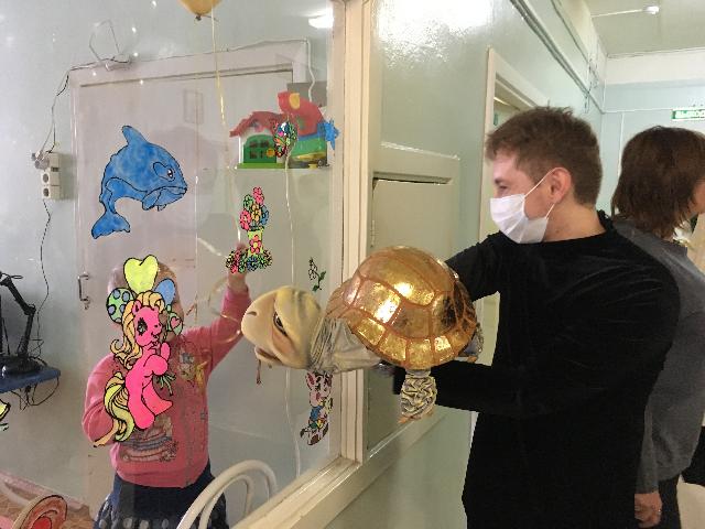 А потом гости пошли по палатам, поскольку, к сожалению, далеко не все пациенты этого отделения имеют возможность передвигаться самостоятельно. К некоторым деткам можно лишь в окошко заглянуть и пообщаться жестами, но сколько же было удивленной радости у крох, завидевших в окне «живую» черепаху, добрую Золушку и преданного Бима…