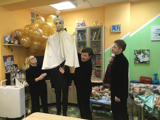 В игровой комнате на втором этаже, куда детки пришли вместе с родителями и медиками, развернулось увлекательное сказочное действо. Куклы оживали на глазах, как говорится, изумленной публики – и на внимательных личиках малышни все ярче и уверенней сияли улыбки. Озорной Петрушка, тростевой Аладдин, кукла планшетная, мимирующая, тантамареска; актеры раскрывали завораживающие «Секреты закулисья» (таково название мастер-класса), что называется, с душой и «в лицах» – и интерес аудитории по ходу импровизированного действа возрастал, кажется, поминутно. Действа замечательного, кроме всего прочего, по атмосфере – теплой, отменяющей всяческую зажатость и располагающей к дружескому общению.
